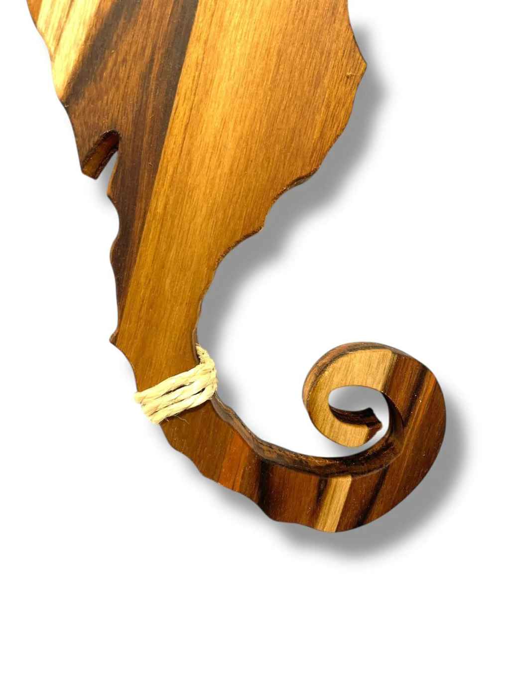 As esculturas do Atelier Bruno Glad são peças artesanais únicas, feitas à mão em madeira nobre teca com 2 cm de espessura, acabamento em óleo mineral que protege e realça os veios da madeira, e detalhes em corda de sisal, trazendo um toque rústico e sagrado.