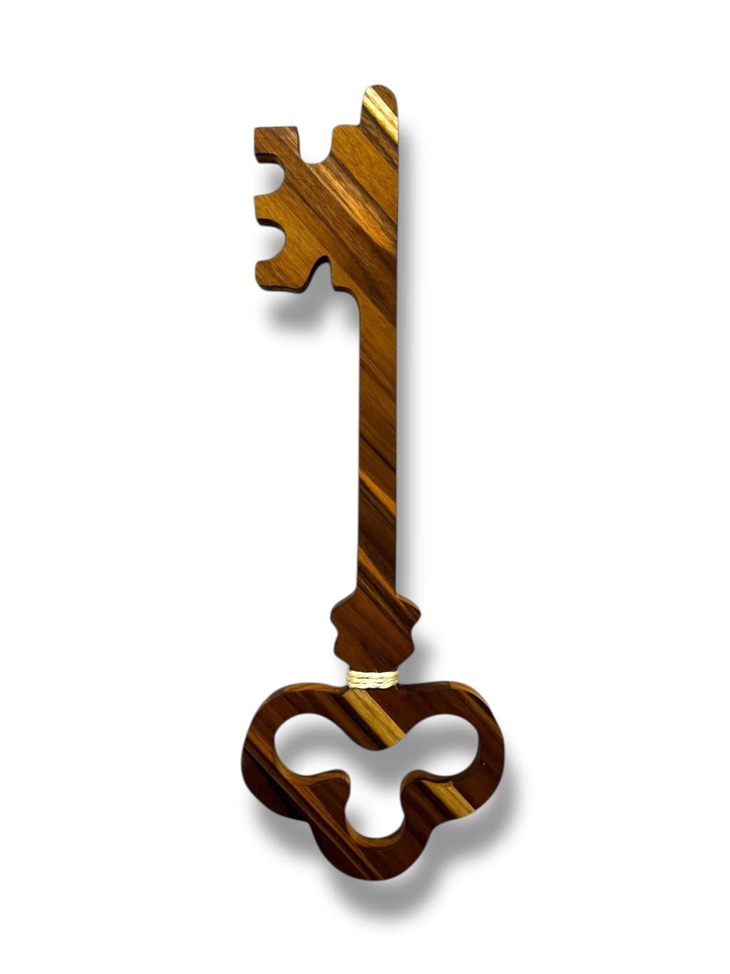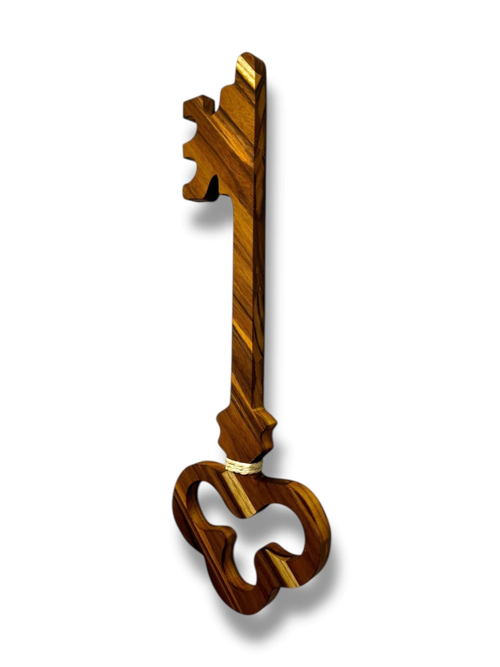 As esculturas do Atelier Bruno Glad são peças artesanais únicas, feitas à mão em madeira nobre teca com 2 cm de espessura, acabamento em óleo mineral que protege e realça os veios da madeira, e detalhes em corda de sisal, trazendo um toque rústico e sagrado.