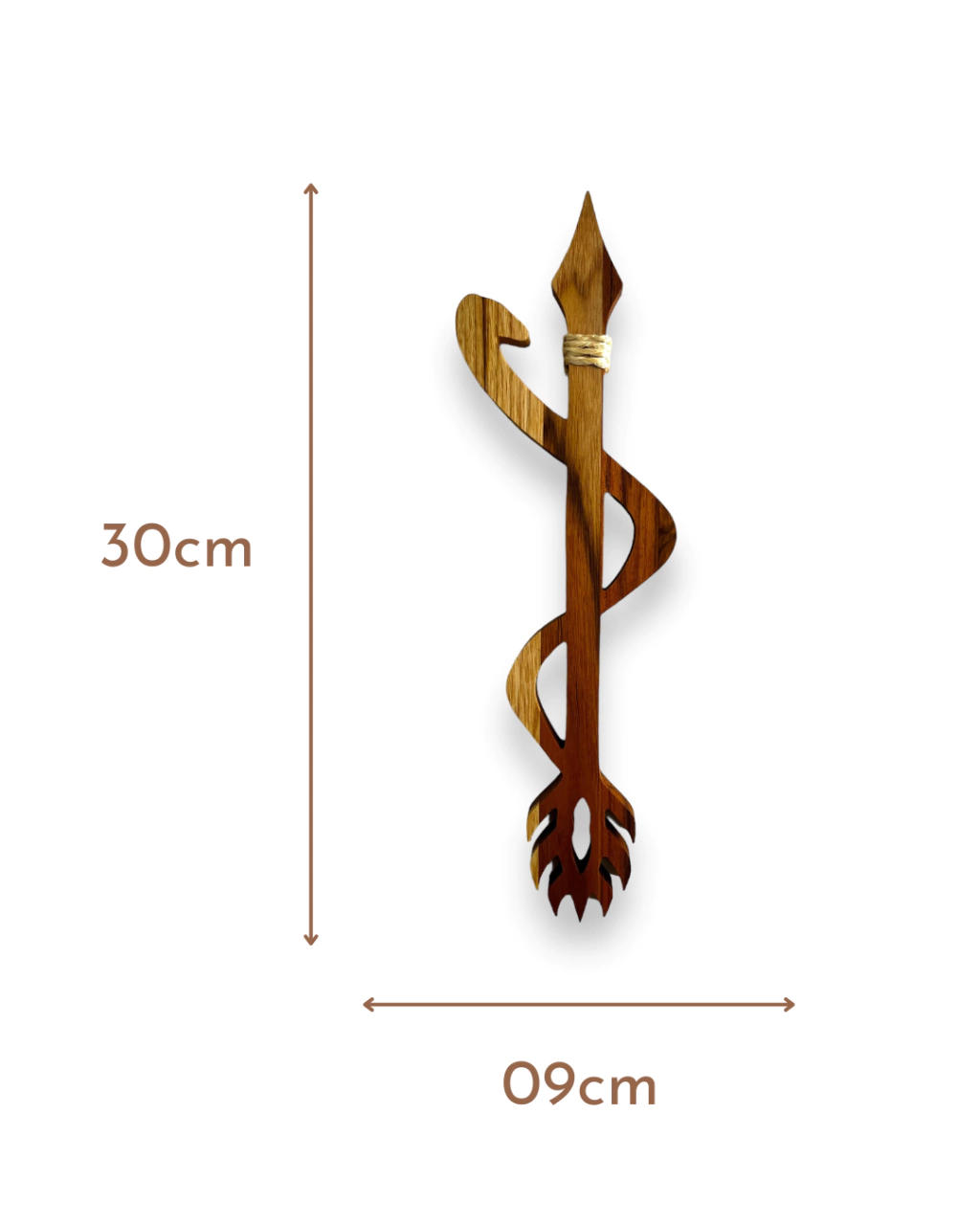 As esculturas do Atelier Bruno Glad são peças artesanais únicas, feitas à mão em madeira nobre teca com 2 cm de espessura, acabamento em óleo mineral que protege e realça os veios da madeira, e detalhes em corda de sisal, trazendo um toque rústico e sagrado.