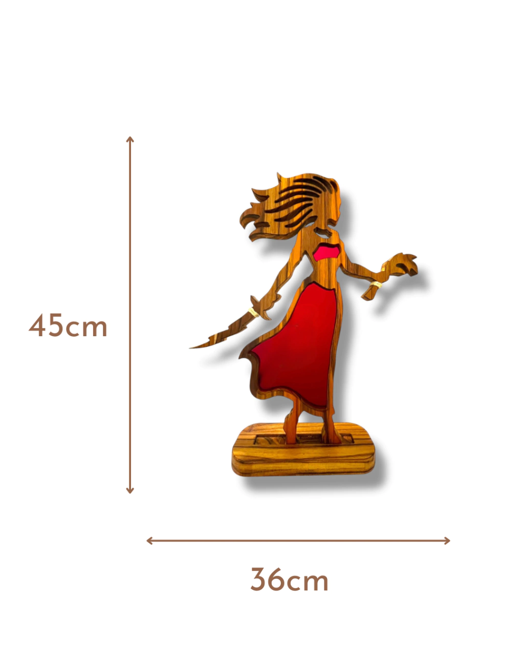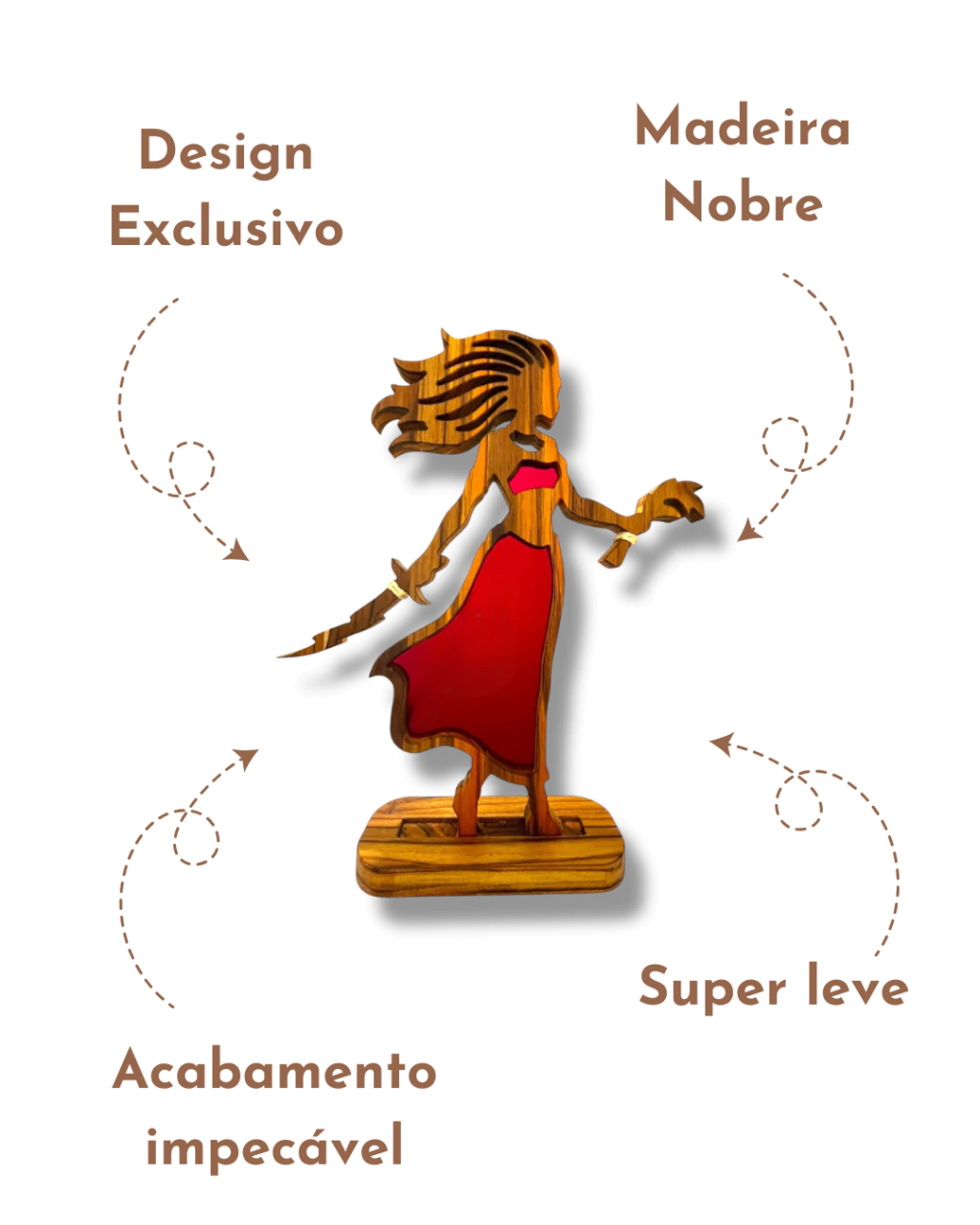 As esculturas do Atelier Bruno Glad são peças artesanais únicas, feitas à mão em madeira nobre teca com 2 cm de espessura, acabamento em óleo mineral que protege e realça os veios da madeira, e detalhes em corda de sisal, trazendo um toque rústico e sagrado.