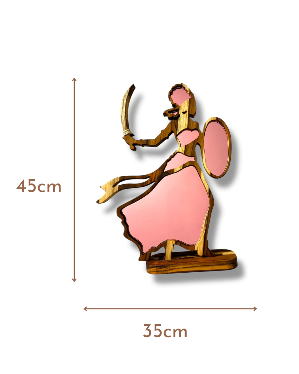 As esculturas do Atelier Bruno Glad são peças artesanais únicas, feitas à mão em madeira nobre teca com 2 cm de espessura, acabamento em óleo mineral que protege e realça os veios da madeira, e detalhes em corda de sisal, trazendo um toque rústico e sagrado.