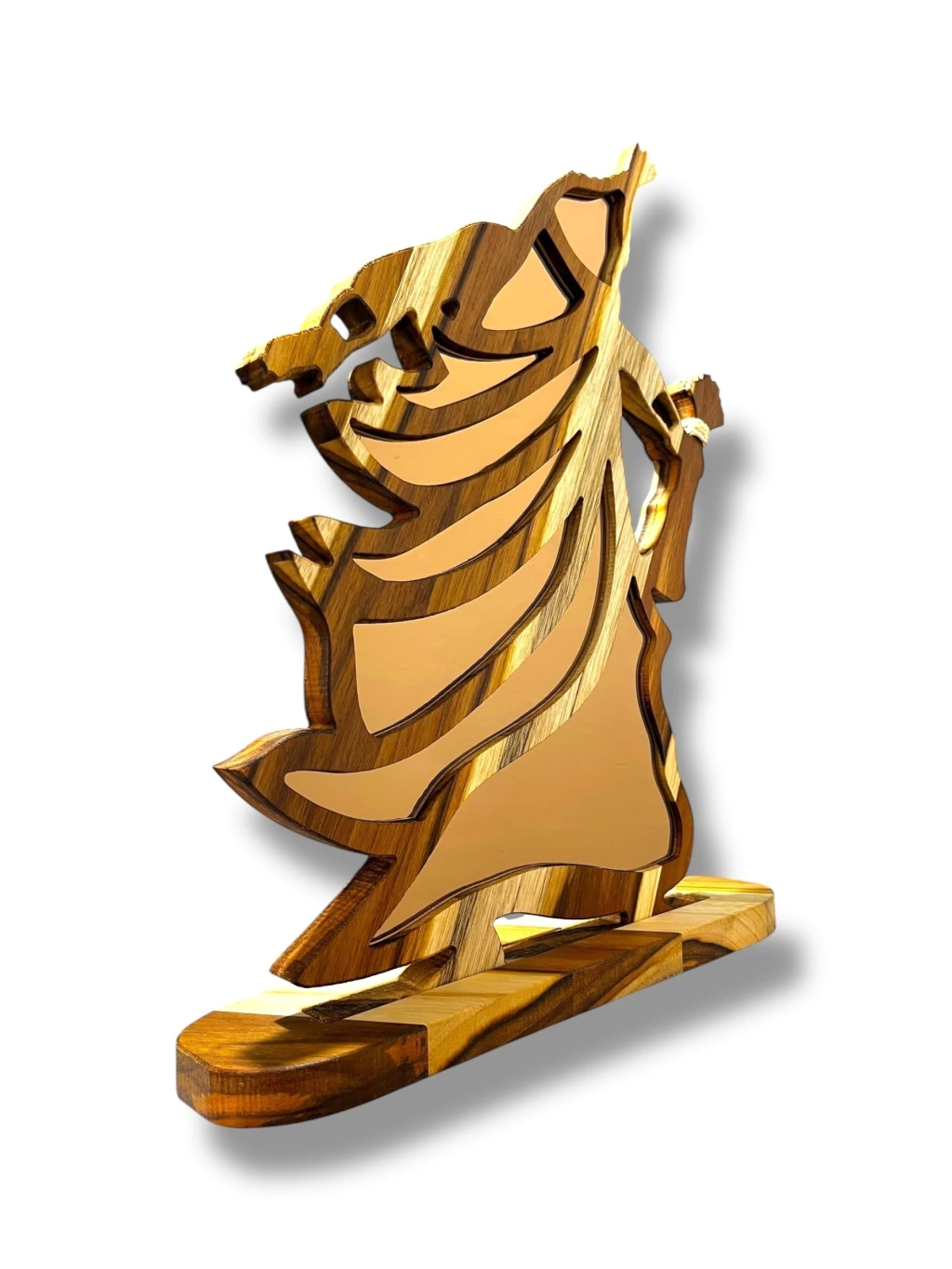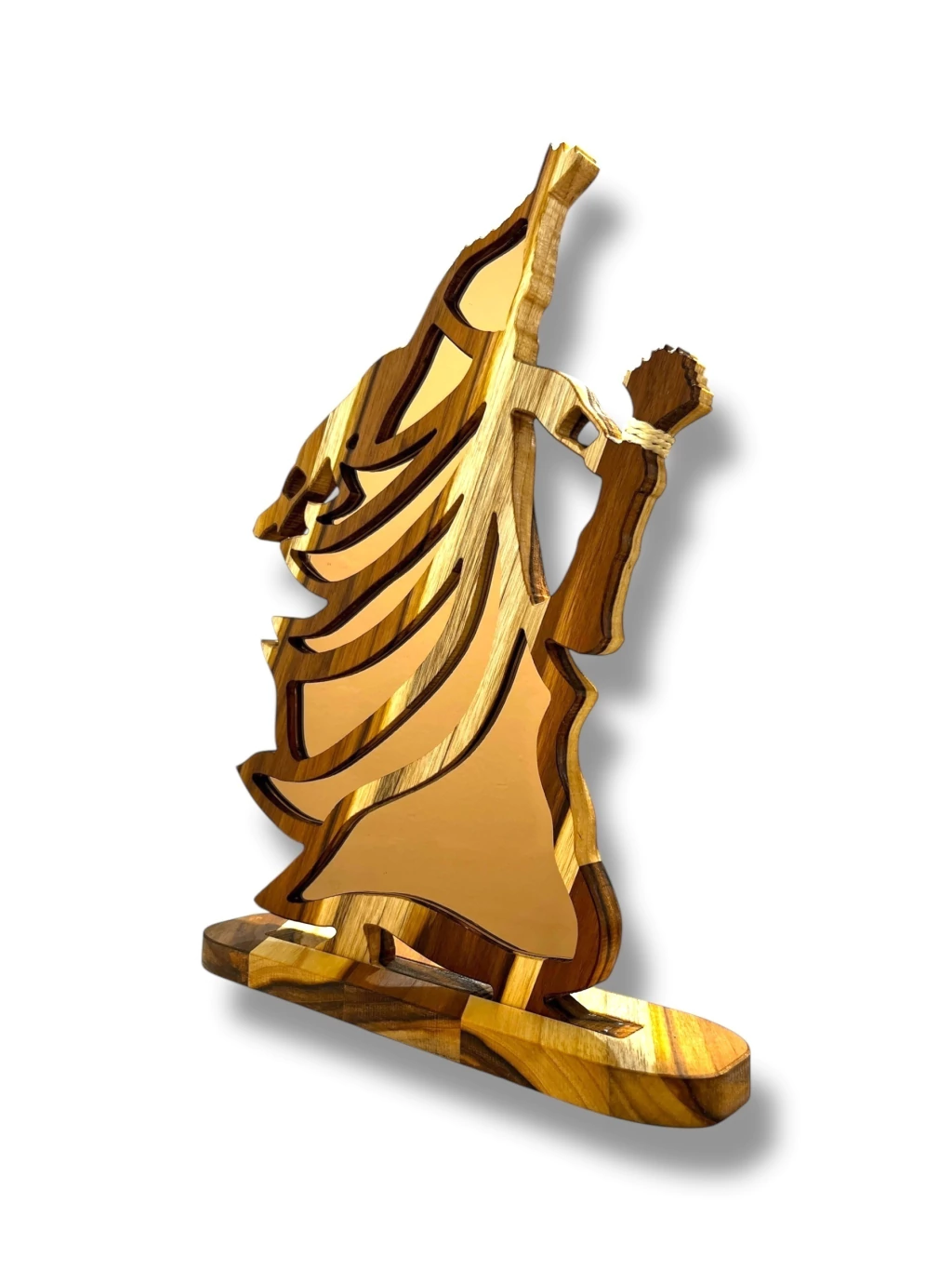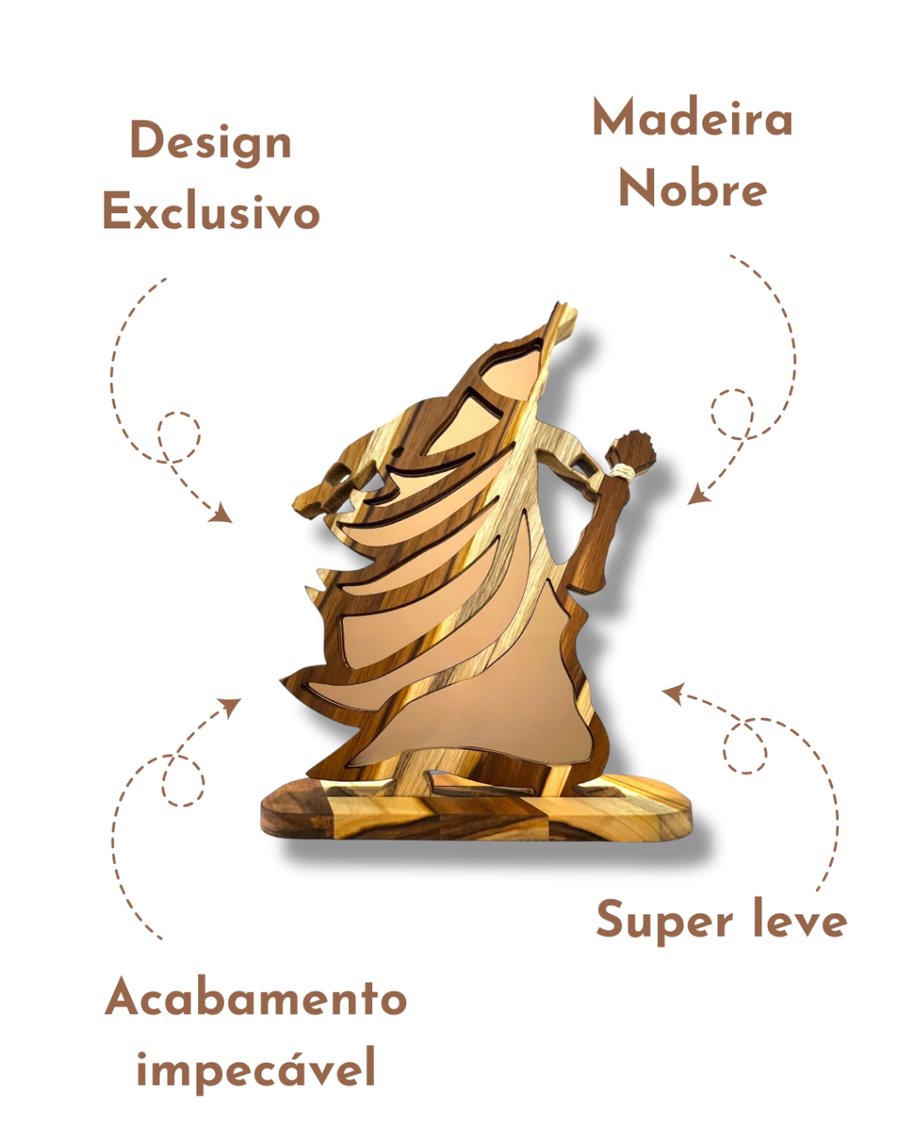 As esculturas do Atelier Bruno Glad são peças artesanais únicas, feitas à mão em madeira nobre teca com 2 cm de espessura, acabamento em óleo mineral que protege e realça os veios da madeira, e detalhes em corda de sisal, trazendo um toque rústico e sagrado.