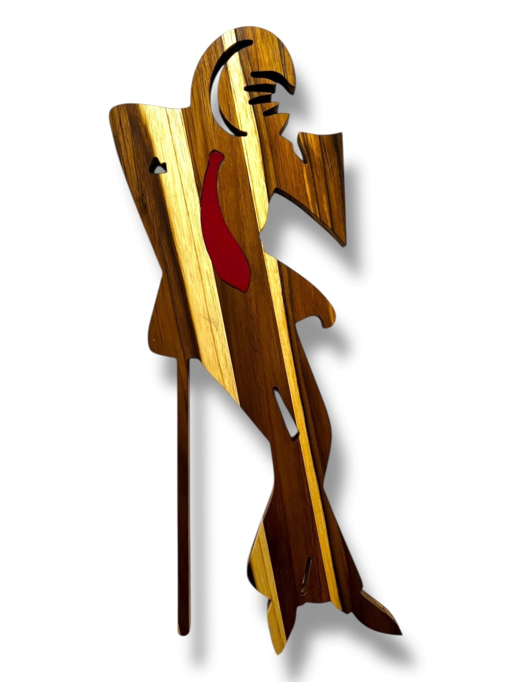 As esculturas do Atelier Bruno Glad são peças artesanais únicas, feitas à mão em madeira nobre teca com 2 cm de espessura, acabamento em óleo mineral que protege e realça os veios da madeira, e detalhes em corda de sisal, trazendo um toque rústico e sagrado.